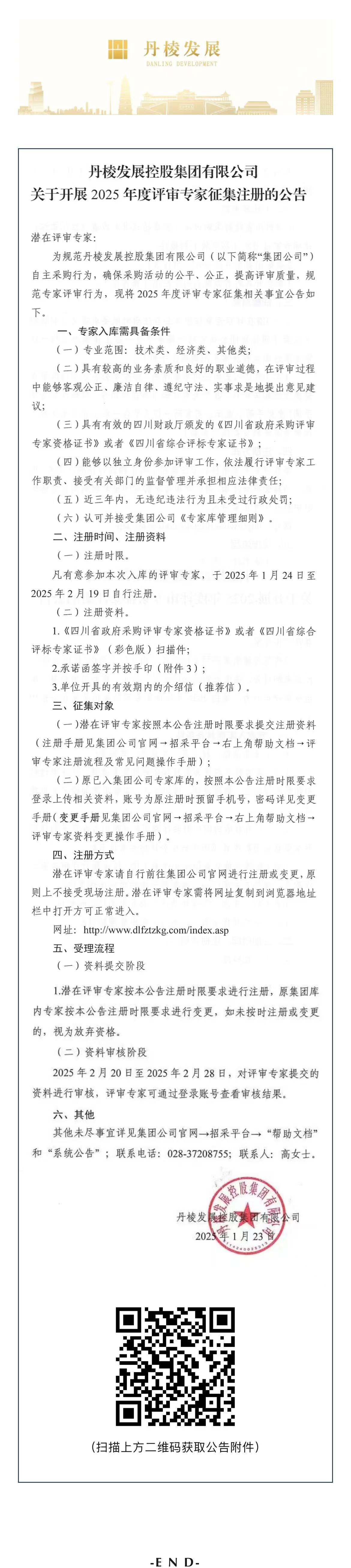 丹棱發(fā)展控股集團(tuán)有限公司關(guān)于開(kāi)展2025年度評(píng)審專(zhuān)家征集注冊(cè)的公告