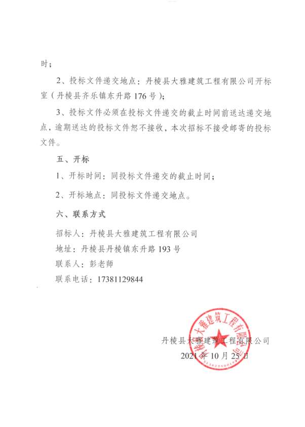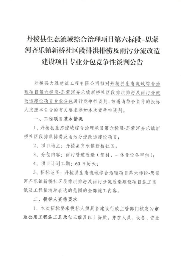 【大雅建筑公司】丹棱縣生態(tài)流域綜合治理項(xiàng)目第六標(biāo)段-思蒙河齊樂鎮(zhèn)新橋社區(qū)段排洪排澇及雨污分流改造建設(shè)項(xiàng)目專業(yè)分包競(jìng)爭(zhēng)性談判公告