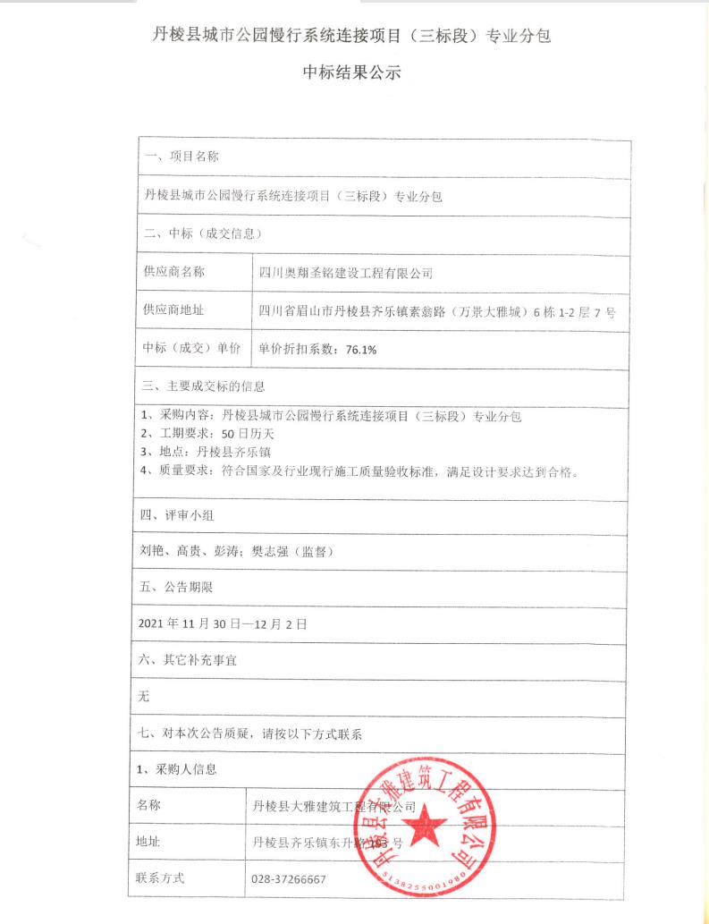 【大雅建筑公司】丹棱縣城市公園慢行系統(tǒng)連接項目(三標(biāo)段)專業(yè)分包中標(biāo)結(jié)果公示