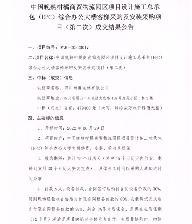 中國晚熟柑橘商貿(mào)物流園區(qū)項目設(shè)計施工總承包(EPC)綜合辦公大樓客梯采購及安裝采購項目(第二次)成交結(jié)果公告