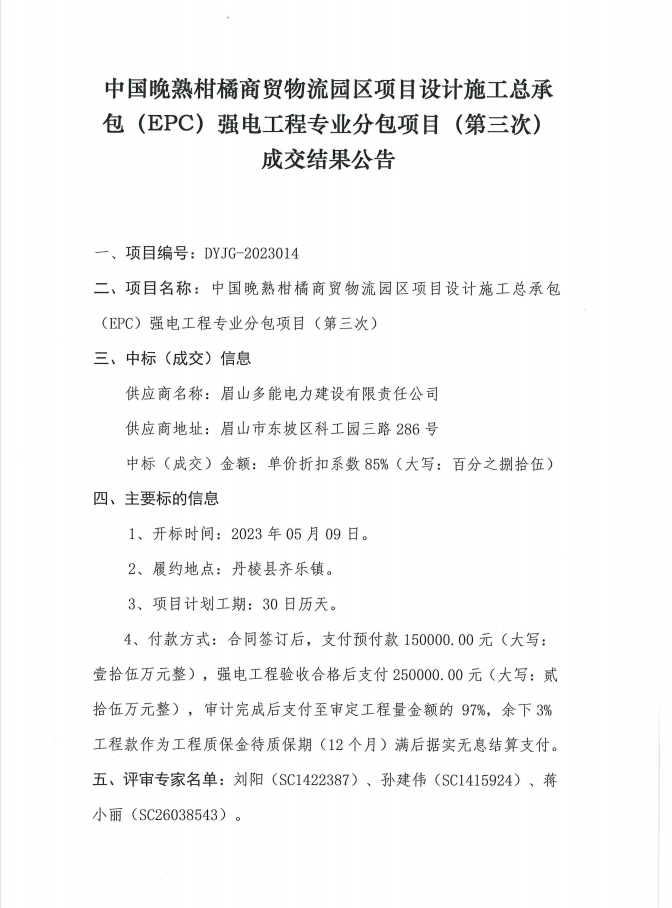 中國(guó)晚熟柑橘商貿(mào)物流園區(qū)項(xiàng)目設(shè)計(jì)施工總承包(EPC)強(qiáng)電工程專業(yè)分包項(xiàng)目(第三次)成交結(jié)果公告