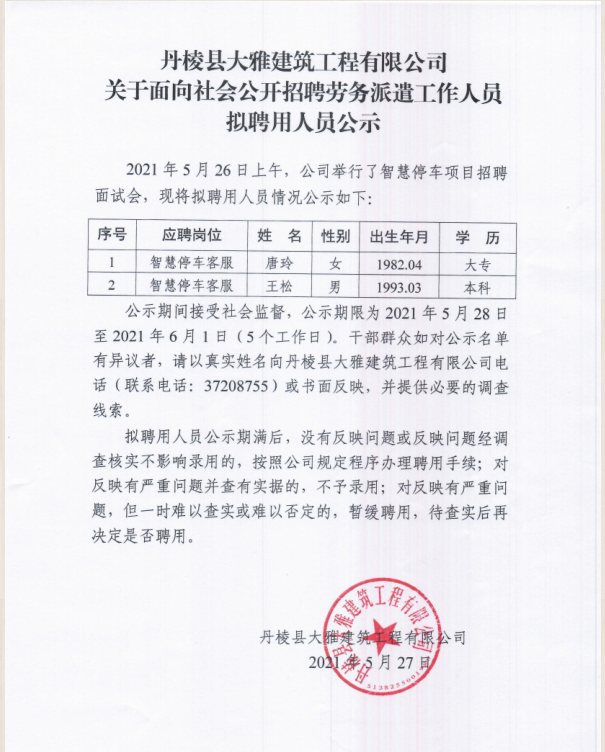 【大雅建筑公司】 關(guān)于面向社會(huì)公開(kāi)招聘勞務(wù)派遣工作人員 擬聘用人員公示