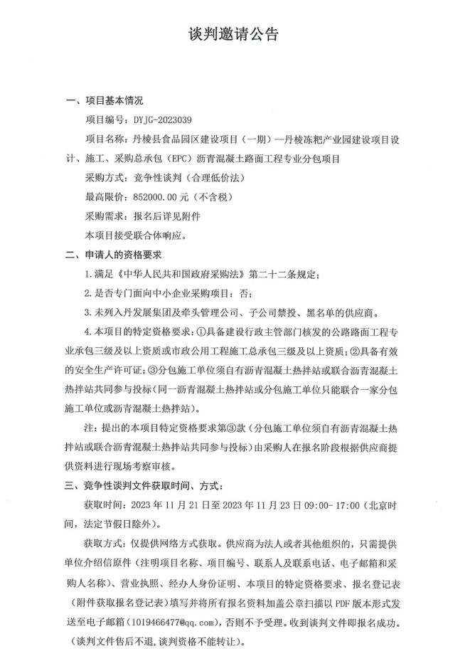丹棱縣食品園區(qū)建設(shè)項(xiàng)目(一期)—丹棱凍粑產(chǎn)業(yè)園建設(shè)項(xiàng)目設(shè)計(jì)、施工、采購總承包(EPC)瀝青混凝土路面工程專業(yè)分包項(xiàng)目談判邀請(qǐng)公告