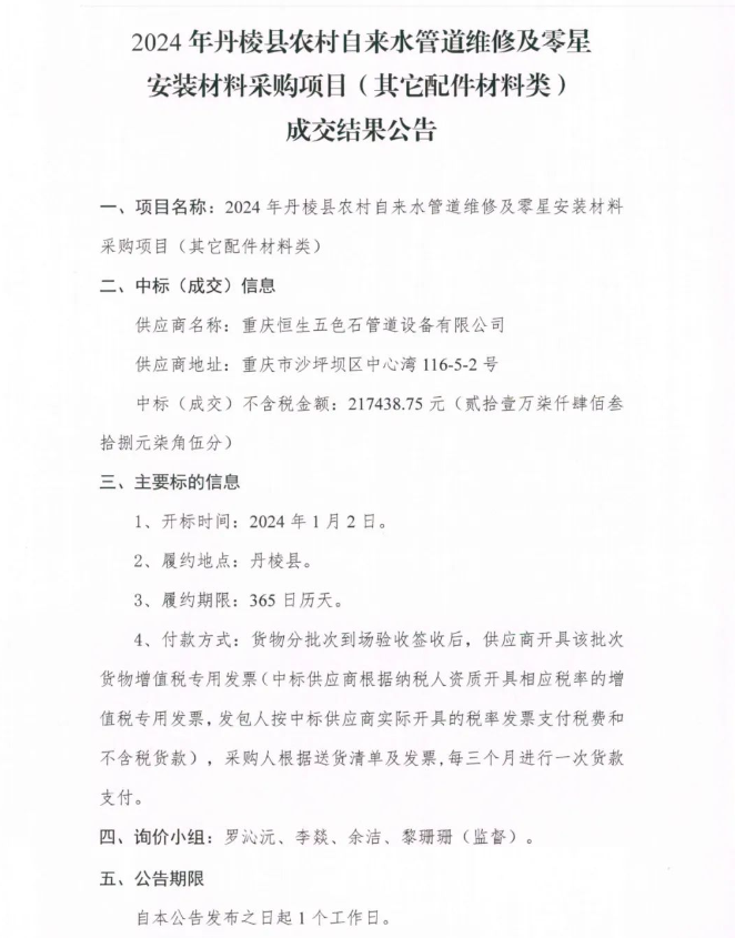 2024年丹棱縣農村自來水管道維修及零星安裝材料采購項目 (其它配件材料類 )成交結果公告