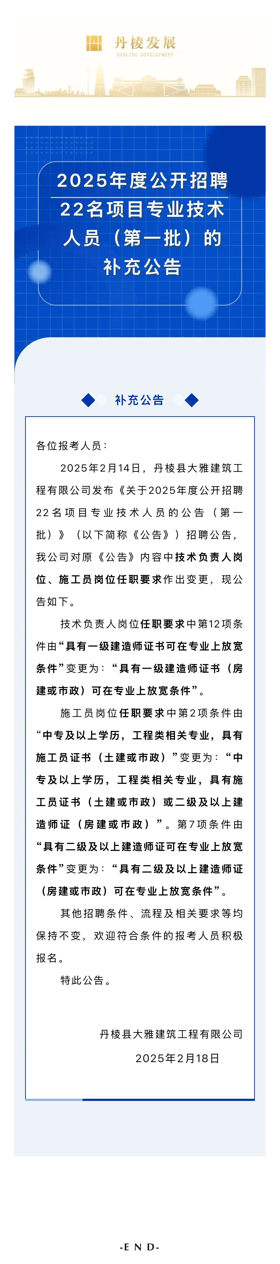 丹棱縣大雅建筑工程有限公司關(guān)于2025年度公開招聘22名項目專業(yè)技術(shù)人員(第一批)的補(bǔ)充公告