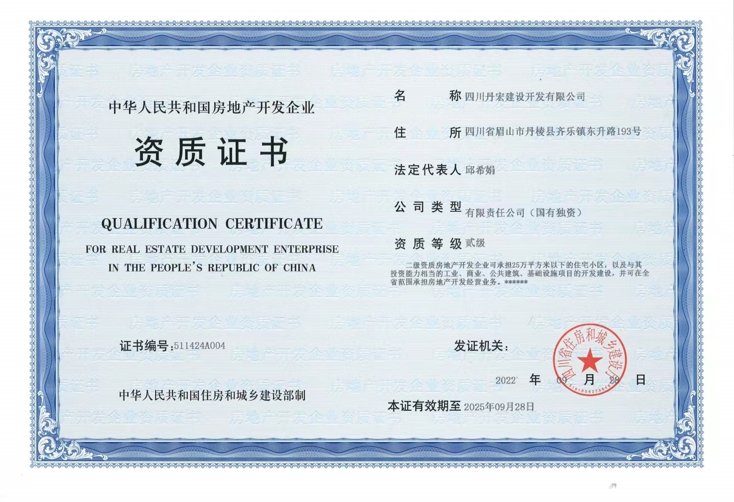 近日,丹發(fā)展集團(tuán)下屬的四川丹宏建設(shè)開發(fā)有限公司順利通過了四川省住房和城鄉(xiāng)建設(shè)廳資格審核,成功獲取了房地產(chǎn)開發(fā)二級(jí)資質(zhì)。標(biāo)志著丹宏公司可承擔(dān)建筑面積25萬平方米以下項(xiàng)目的開發(fā)建設(shè),并可在全省范圍承擔(dān)房地產(chǎn)開發(fā)經(jīng)營業(yè)務(wù),為進(jìn)一步擴(kuò)大建設(shè)規(guī)模及開發(fā)區(qū)域奠定了堅(jiān)實(shí)基礎(chǔ)。